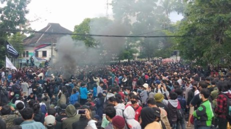 BANDUNG, (AKN).- Pengesahan UU Cipta Kerja oleh DPR, disambut demo di berbagai tempat, Selasa (6/10/2020). Massa yang terdiri mahasiswa dan buruh pabrik menyuarakan kekecewaannya, mengecam langkah pemerintah dan DPR yang dinilai merugikan kaum pekerja. Di Bandung, massa mahasiswa dari sejumlah perguruan tinggi menggeruduk kantor DPRD Jawa Barat di Jln. Diponegoro.